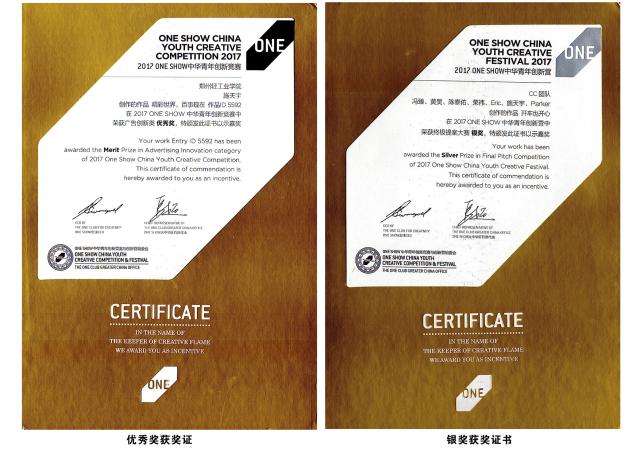 近日,2017 One Show中华青年奖终极提案大赛及颁奖典礼于11月8日在上海举办。本次比赛在高校推广阶段共收到来自中国大陆、香港、澳门、台湾及美国密歇根州立大学共2655组(3891件)作品。比赛由初赛入围、复赛班级提案、终极提案三个阶段组成。我校艺术设计学院2016级动画系研究生施天宇在导师李和畅副教授的指导下,视频作品:《精彩世界,百世现在》获得优秀奖,取得进入复赛资格,复赛阶段与云南大学、美国密歇根州立大学共7名学生组成团队,根据雪佛兰品牌发布的命题,通过班级提案,终极提案的现场评比,最终拿下银铅笔奖。