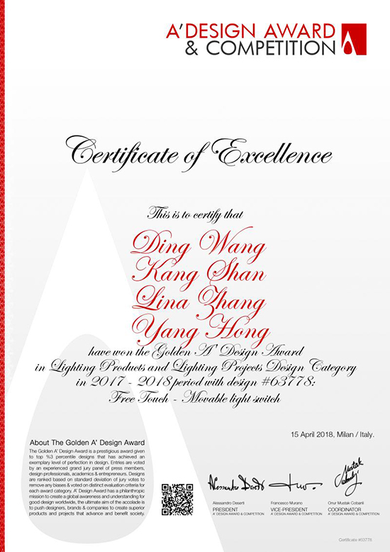 Golden A' Design Award】2017-2018年度“照明产品及照明工程设计类”金奖