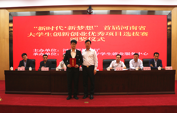 近日,新时代·新梦想首届大学生创新创业优秀项目选拔赛在河南省大学生就业创业综合服务基地举行,省教育厅副巡视员李金川等领导出席活动并为获奖团队颁奖。我校学生在此次比赛中表现突出,取得了优异成绩。