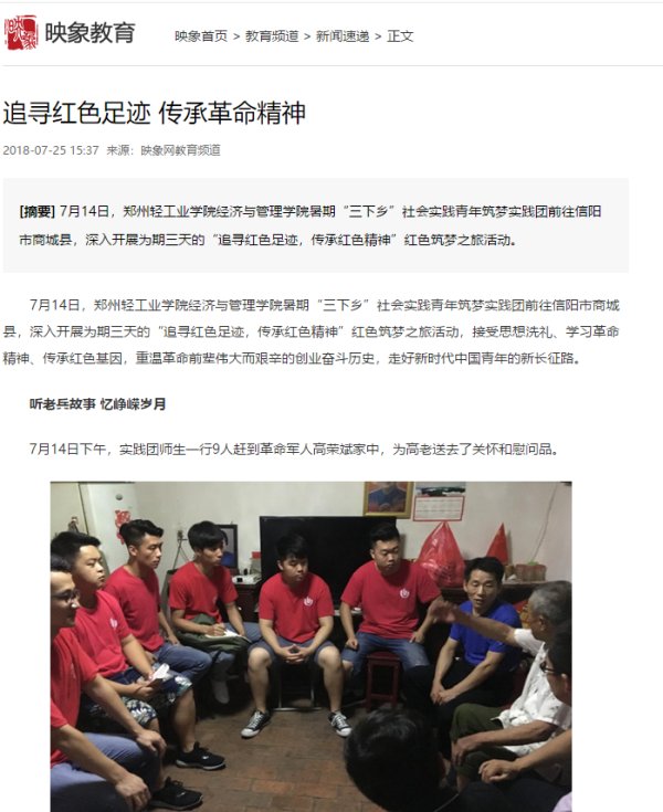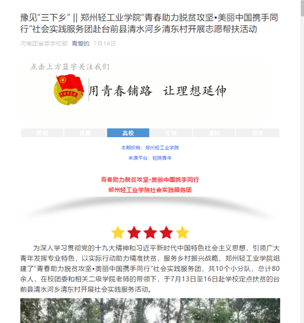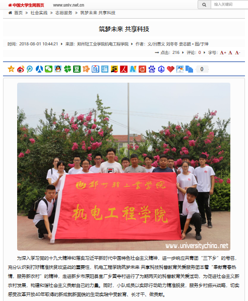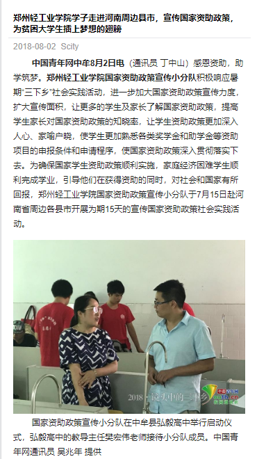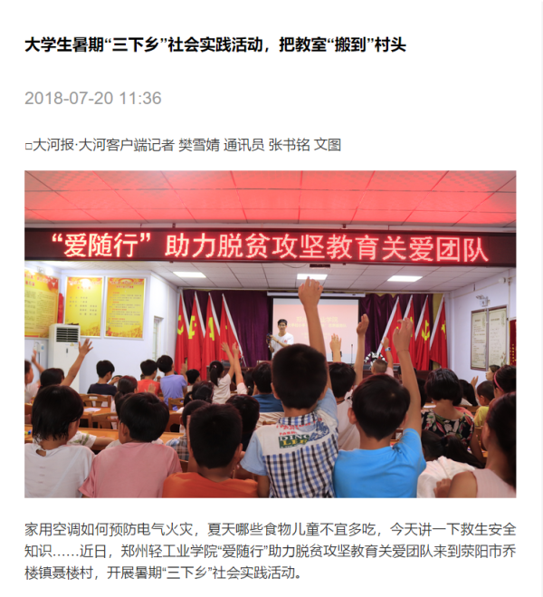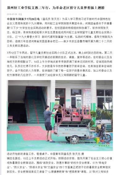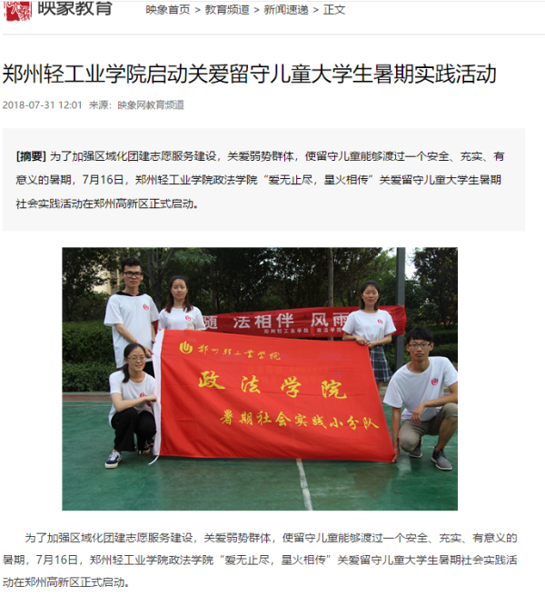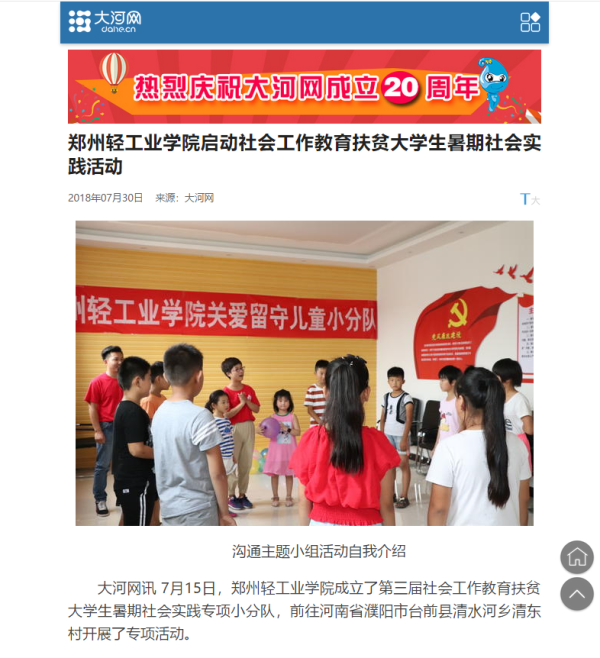 该服务队已被大河网所报道:(郑州轻工业学院启动社会工作教育扶贫大学生暑期社会实践活动: