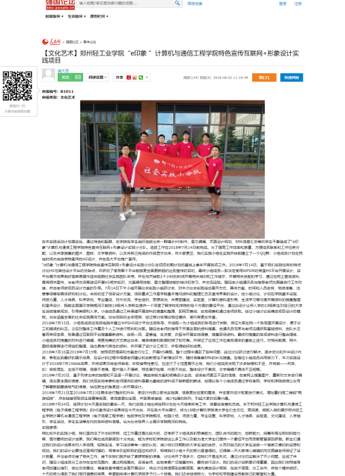 该服务队已被人民网所报道:(【文化艺术】郑州轻工业学院“e印象 ”计算机与通信工程学院特色宣传互联网+形象设计实践项目: