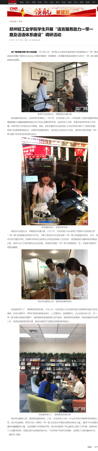 该服务队已被中国人民广播电台所报道:(郑州轻工业学院学生开展“语言服务助力一带一路及话语体系建设”调研活动: