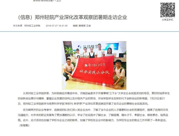 该服务队已被新华网所报道:(郑州轻院产业深化改革观察团暑期走访企业: