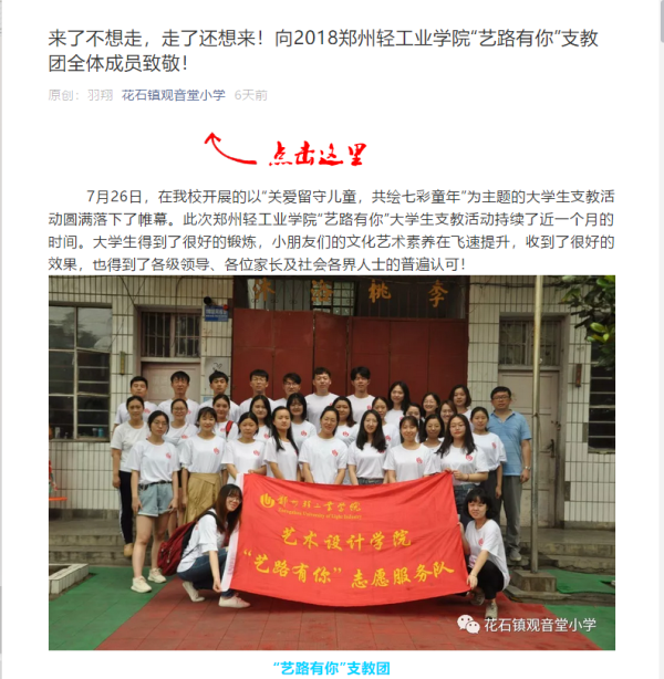 24艺术设计学院“艺路有你”艺术支教小分队花石镇观音小学公众号:来了不想走,走了还想来!向2018郑州轻工业学院“艺路有你”支教团全体成员致敬!