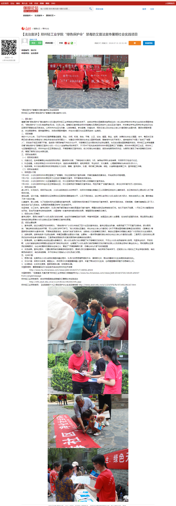 3.人民网-强国论坛:【法治宣讲】郑州轻工业学院“绿色保护伞”禁毒防艾普法宣传暑期社会实践项目