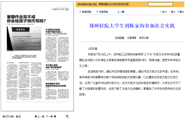 21体育学院改革开放40年“太极文化”的传承与弘扬调研队大河网:郑州轻院大学生到陈家沟参加社会实践