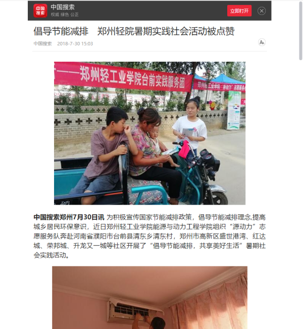该服务队已被中国搜索、环保舆情网、国信参要网、今日头条报道:倡导节能减排郑州轻院暑期实践社会活动被点赞