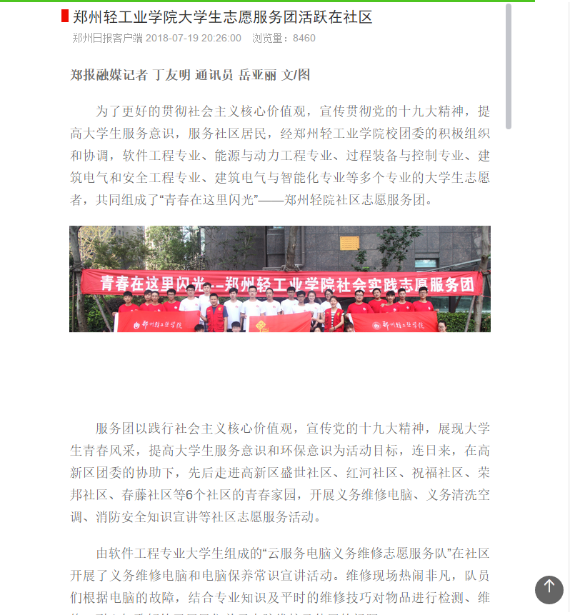 该服务队已被郑州日报报道:(郑州轻工业学院大学生志愿服务团活跃在社区