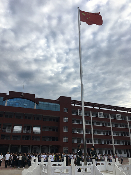 在大家的热切期待中,校国旗护卫队迈着雄壮有力的步伐,护送国旗入场,在全体师生的注目礼中,五星红旗伴随着《义勇军进行曲》冉冉升起。