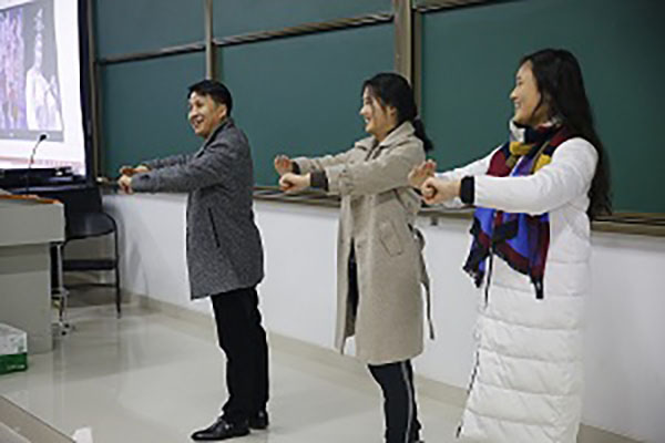中国传统戏曲是我国民间艺术的瑰宝,是以演员表演为中心,以唱、念、做、打等手段为基础,融文学、音乐、舞蹈、美术、杂技等为一体的综合性艺术,是一种无形的历史文化遗产。周武占老师以传统戏曲角色生、旦、净、末、丑为切入点,结合大量的图片和影视素材,向大家详细的展示了戏曲丰富多彩的表达形式,进而深入的诠释了戏曲艺术的审美意趣和文化内涵。周老师在讲到戏曲的形体表现时特别阐述了戏曲的精气神与现实生活中个人气质的内在联系,并引领全场同学共同体验了手眼身法,并集体演绎了经典名剧《花木兰》片段。室外数九寒冬,室内热情涌动。数百名师生共唱一曲,全场气氛达到高潮。周武占老师还详细介绍了在戏曲表演中常用的民族乐器,并亲自用板胡为大家表演了豫剧经典片段。最后,他建议广大同学一定要多多了解戏曲的背景知识,观赏戏曲表演,用心体会中国戏曲的博大精深。