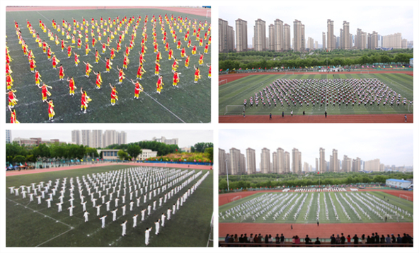 音乐再次响起,学生太极拳表演、教工八段锦表演、学生团体操展示等节目纷纷亮相,3000余名师生以其精彩的表演赢得了现场观众的阵阵掌声与喝彩,集中展现了我校开展阳光体育活动的成果,现场鼓声、欢呼声汇成一片欢乐祥和的海洋,将开幕式表演推向高潮。整场开幕式精彩纷呈、振奋人心,为下一步的比赛做好了铺垫。