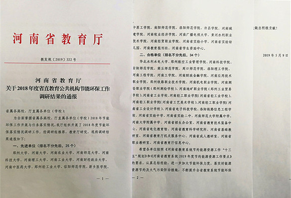 2019年5月17日,由河南省教育厅组织的省高校后勤协会一届二次理事会暨第二次全体会员大会在三门峡市召开。会议传达学习了2019年全省教育工作会议精神,审议通过了河南省高校后勤协会2018年工作报告和2019年主要工作,并对河南省高校后勤工作先进单位进行了表彰。我校荣获“河南省高校后勤工作先进集体”和“2018年度省直教育公共机构节能环保工作先进单位”两项荣誉。