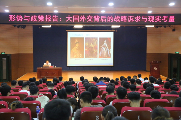 报告中,俞书记结合多年教学实践和研究,以全球时事热点为切入点,以翔实的数据、鲜活的事例、多方位视角从“国际形势分析”“中美贸易战实质”“中国如何应对”三个层面进行深入的分析和解读,勾勒出一幅波澜壮阔的国际局势全景图。报告回顾了在中国共产党领导下新中国70年砥砺奋进的发展历程,分析了美国对华战略的演变进程和美国各界对华态度的转变,揭示了中美贸易战的本质及其背后的战略诉求。俞书记指出,面对纷繁复杂的国际国内形势,广大师生要树立正确的历史观、大局观、角色观,剥茧抽丝,化繁为简,建立纲举目张的知识体系和思维体系,深入理解党和国家的一系列方针政策,准确把握国家发展大势和自身所处的历史方位。