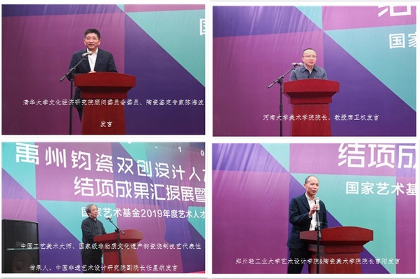 10月14日上午,由国家艺术基金资助、开云手机版登录入口主办、禹州钧官窑址博物馆协办的国家艺术基金2019年度艺术人才培养资助项目“禹州钧瓷双创设计人才培养”学员结业作品展开幕式暨学术研讨会在郑州升达艺术馆举行。河南省文化和旅游厅艺术处黄寒秋处长、河南省文化和旅游厅非遗处张松涛处长、河南省文化和旅游厅非遗处祝欣副处长、国家艺术基金项目监督员、国家艺术基金河南办公室明巧玲副主任、河南美术家协会副主席、河南大学美术学院袁汝波教授、河南省文化艺术研究院研究馆员、非遗专家尚春升先生、开云手机版登录入口副校长方少明教授、清华大学文化经济研究院顾问委员会委员陈海波先生、中国艺术研究院侯样祥研究员、禹州市钧瓷试验区办公室主任霍保宏先生、河南工艺美术协会名誉会长张玉驫先生、河南省陶瓷玻璃行业协会会长王爱纯女士、河南工艺美术协会副会长陈柏伶女士、中国工艺美术大师、国家级非物质文化遗产项目钧瓷烧制技艺代表性传承人任星航先生、中国陶瓷艺术大师、河南省工艺美术大师、河南省陶瓷艺术大师李明先生、景德镇陶瓷大学特聘客座教授、研究员、河南省工艺美术大师刘志军先生、河南大学美术学院院长席卫权教授、许昌学院设计艺术学院院长王雨教授、平顶山学院中原古陶瓷研究重点实验室主任孙晓岗博士、洛阳师范学院历史文化学院刘祥辉副教授,以及相关专业教师、项目学员等参加了会议。