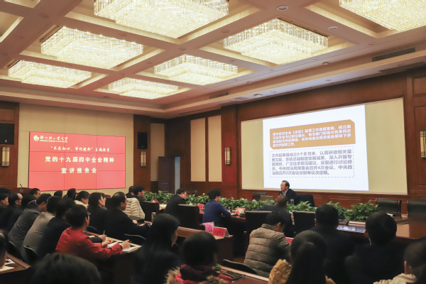 报告会上,程传兴教授以《开辟“中国之治”新境界——深入学习党的十九届四中全会精神》为题,围绕“坚持和完善中国特色社会主义制度、推进国家治理体系和治理能力现代化的重大意义”“中国特色社会主义制度和国家治理体系的显著优势”“坚持和完善中国特色社会主义制度、推进国家治理体系和治理能力现代化的战略部署”“全面贯彻落实四中全会精神”等四个方面,结合工作实际,对四中全会精神进行了系统阐述和深入解读。宣讲报告主题鲜明、内容丰富、思想深刻、深入浅出,既有很强的思想性、理论性,又有很现实的实践性、引领性,对全校干部师生学习领会、贯彻落实党的十九届四中全会精神具有重要的指导意义。