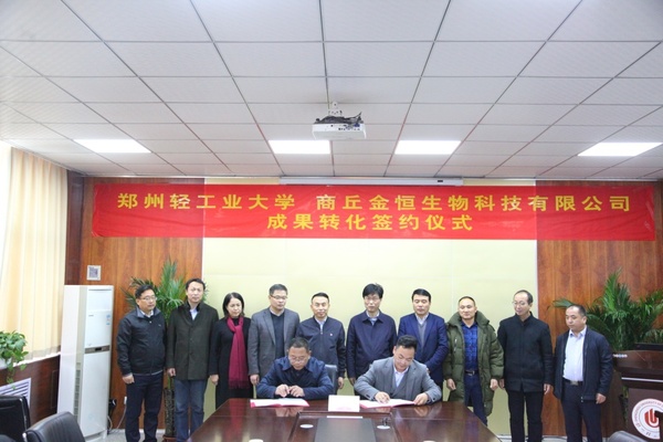 最后,在校领导及相关职能部门领导见证下,我校科技处处长张建伟教授与商丘金恒生物科技有限公司董事长郭参军签订了技术转让合同,当场盖章生效,双方愉快地合影留念。(通讯员:李玉)