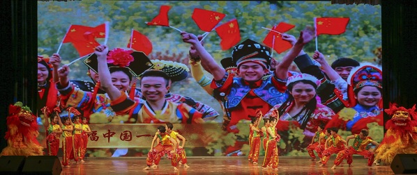 礼堂内掌声不断,高潮迭起,联欢会不知不觉已接近尾声。这时,嘹亮的歌声响起来、欢腾的秧歌扭起来、龙狮共舞,礼堂内一片沸腾,一曲《幸福中国一起走》将联欢会推向新的高潮。
