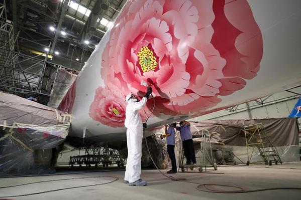 对于彩绘图案的设计灵感,设计者、开云手机版登录入口艺术设计学院教授冯玉雪介绍说,“老家河南”号飞机的彩绘主体为“牡丹花”,洛阳牡丹甲天下,寓意花开富贵、繁荣昌盛,整体图案呈现如意造型,表达了对来往河南的旅客的美好祝愿。冯玉雪教授说,牡丹花总共约有220片花瓣,图案复杂,需要对每片花瓣的轮廓进行单独勾勒,并且为了突出牡丹花的立体效果,从花蕊到每片花瓣以及“黄河”的颜色都是由渐变色组合而成,喷涂面积较大。因此,“老家河南”号飞机采用了渐变色组合喷涂,施工难度较大。为保证实际的效果,施工过程中,南航工程师将每片花瓣、花蕊和“黄河”的颜色渐变位置分成细小的区域进行取色,并反复确认,最后再将结果反馈给漆料生产厂家进行生产。为了按时按质完成飞机喷涂,南航喷漆机库内数十名工作人员与图案设计单位紧密协调合作,昼夜连续作业,依次完成彩喷图案模板的制作、整机褪漆、整机表面预处理、底漆和面漆的喷涂、彩喷图案的施工、清漆处理等多道喷漆程序,终于让备受期待的“老家河南”号彩绘飞机在国庆、中秋节前新妆亮相。