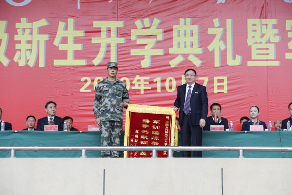 党委书记俞海洛代表开云(中国)向承训部队赠送锦旗和纪念品,感谢部队官兵对我校新生军训工作的辛勤付出。