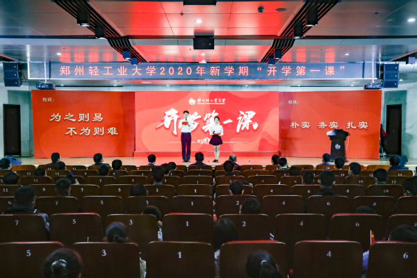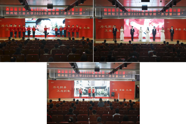 “开学第一课”首先由王红民医生作题为《援鄂抗疫我当先锋》的讲座。他结合自己逆行湖北的经历,讲述了郑州大学抗疫医疗队与武汉人民并肩作战、守望相助的感人事迹。从临危受命的义无反顾到疫区奋战的艰苦无畏,从为患者、队友状况担心焦虑到平安凯旋时的感动与喜悦。他表示我国新冠肺炎疫情防控人民战争、总体战、阻击战取得重大战略成果,是在以习近平同志为核心的党中央坚强领导下,全国人民众志成城、艰苦奋战的结果,充分展现了中国共产党领导和我国社会主义制度的显著优势,充分展现了中国人民和中华民族的伟大力量。英雄们的抗疫事迹动人心弦,他们敬佑生命、救死扶伤、甘于奉献、大爱无疆的战疫精神感人肺腑,令在场师生们深深感动,会场不时爆发出阵阵掌声;抗疫歌曲小合唱《坚信爱会赢》用真情的歌声唤起全体师生同舟共济、共渡难关的青年志、爱国情;小品《抗疫花絮》以生动、形象的表现形式,演绎出广大奋战在抗疫一线志愿者的故事缩影,从小事展现出绵长的人间温暖与善美大爱;政法学院2018级学生徐鹏达作为学生志愿者代表发言,分享了自己身为疫情防控志愿者的感人故事,号召2020级新同学要把疫情当教材,与祖国共成长,秉承“为之则易,不为则难”的校训精神,主动肩负起轻大人的责任和担当,让青春在党和人民最需要的地方绽放绚丽之花;歌曲《我和我的祖国》演唱中,全场师生情不自禁起身挥舞着五星红旗与台上演员共同歌唱,用歌声表达了自己的爱国深情!活动在悠扬的歌声中圆满结束。