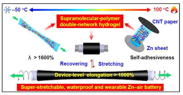 本研究通过将非共价键自组装的鸟苷超分子网络引入到共价交联的聚合物网络中,首次设计构筑了一种小分子基超分子-聚合物双网络(SP-DN)水凝胶电解质,并成功将其应用于高拉伸、防水和宽温域锌-空气电池中。该锌-空气电池具有> 1000%设备级水平的拉伸率和出色的防水性,并且能够在―50至100 ℃正常稳定工作。该研究为高拉伸和环境适应性能源供给设备的水凝胶电解质的设计提供了一种新的思路。