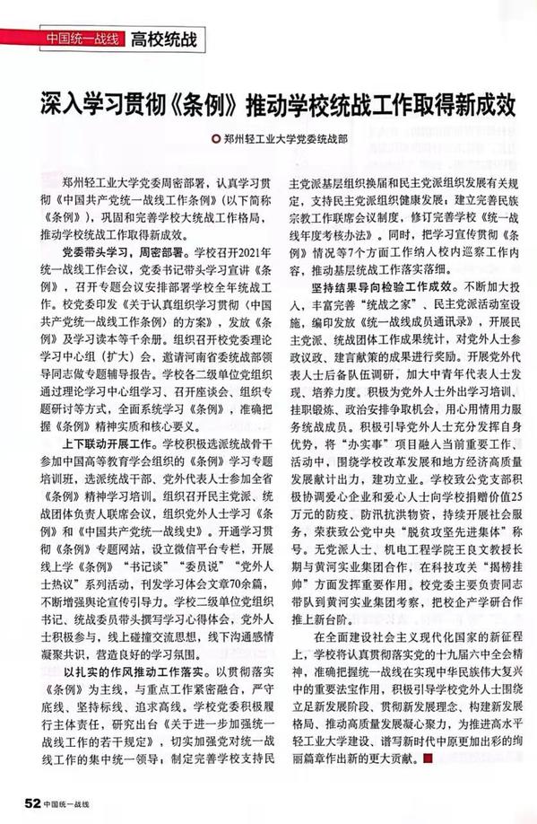 最新出版的2022年第1期《中国统一战线》杂志,以《深入学习贯彻<条例> 推动开云(中国)统战工作取得新成效》为题,刊发了我校统战工作经验文章,集中展示了我校统战工作的新进展。