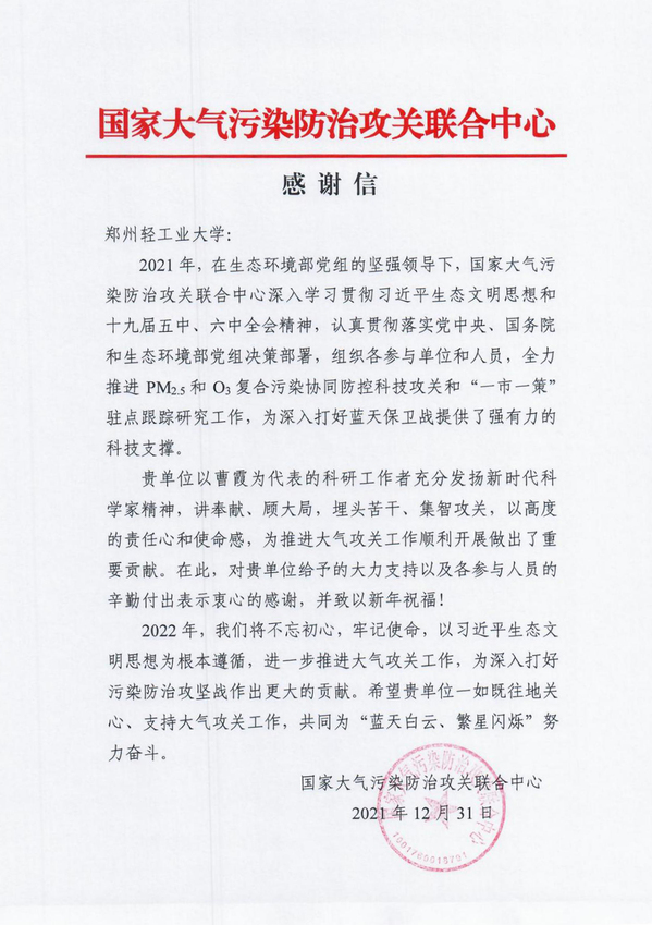 近日,国家大气污染防治联合攻关中心给我校发来感谢信,对我校给予的“一市一策”工作的大力支持和参与人员的辛勤付出表示衷心的感谢,并致以新年祝福。