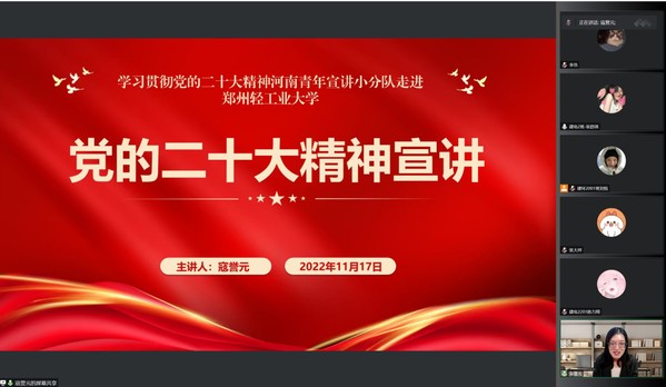 根据《河南共青团关于组织开展学习贯彻党的二十大精神宣讲活动的通知》要求,11月17日,学习宣传贯彻党的二十大精神河南青年宣讲小分队成员寇誉元、范丹莹以线上会议的形式分别在我校作主题宣讲。建筑环境工程学院团校培训班全体学员、学生社团服务中心科开云(中国)区全体学生骨干参与宣讲会。