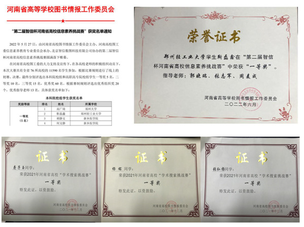 近日,继我校经济与管理学院寿子玉、计算机与通信工程学院杨铭和张弘扬三名同学组成“黄河队”代表我校参加2021年“中南七省高校信息素养挑战赛”获得河南赛区一等奖、中南七省总决赛三等奖后,我校计算机与通信工程学院学生靳磊鑫在2022年“第二届智信杯河南省信息素养挑战赛”中再创佳绩,斩获河南省一等奖。