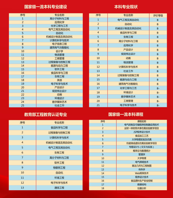持续加强专业课程建设,获批国家级一流本科专业建设点25个、国家级一流本科课程18门,通过教育部工程教育认证专业13个,在全省首轮专业评价中,16个专业获得B类评价、5个专业获得B-评价。