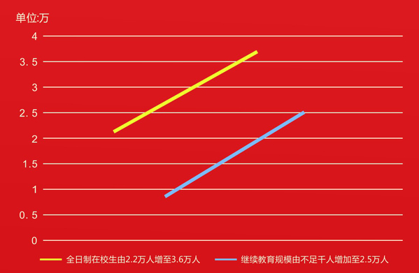 大力扩充办学规模,全日制在校生由2.2万人增加至3.6万人,继续教育规模由不足千人增加至2.5万人。
