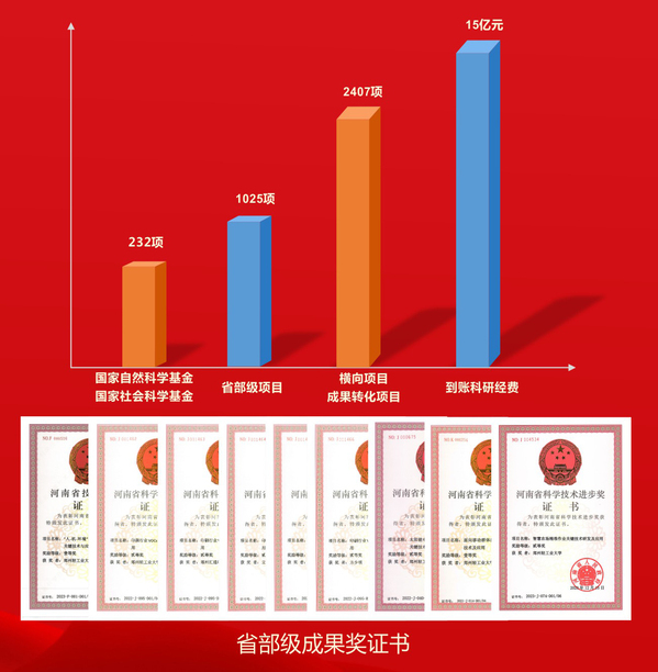 积极推动有组织科研,建立完善考核奖励机制,获批国家自科基金、社科基金232项,承担省部级项目1025项,各类横向项目和成果转化项目2407项,到账科研经费突破15亿元,项目数量和经费总额再创新高。