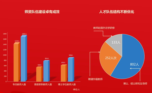 大力实施“人才强校”战略,持续推进师资队伍建设“四大工程”,专任教师由1426人增至1682人,高级职称教师由560人增至834人,博士学位教师由650人增至928人,博士、硕士研究生导师802人,聘请外籍教师252人次,选派133名教师赴国外访学研修。