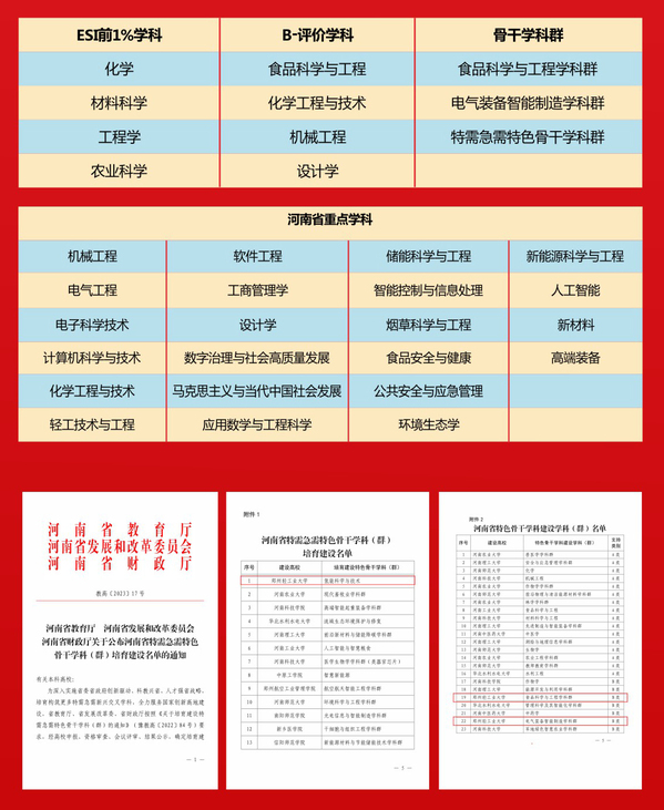 4个学科进入ESI全球排名前1%,4个学科在教育部第五轮学科评估中获得B-评价,3个学科入选河南省特色骨干学科群,22个学科入选新一批河南省重点学科。