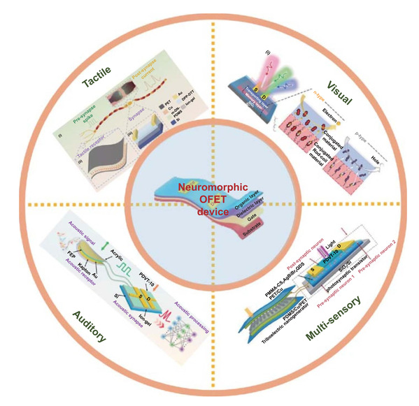 随着各种人工电子器件的发展,信息和数据的数量将呈爆炸式增长,这些信息和数据通过原位来处理会大幅降低器件和系统的功耗。仿生的人工突触器件能够以并行方式存储和处理信号,从而提高了人工系统的容错性并降低了功耗。由于有机场效应晶体管(OFET)适用于大规模集成电路和柔性器件,是生物仿生神经形态系统中很有前途的元件。本文综述了基于神经形态OFET器件的有机半导体材料、结构和制造方法,以及各种人工感觉系统的功能。