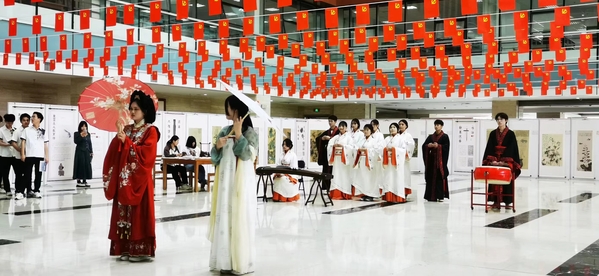 表彰会当天,展示传统文化“寒食节”为主题的第四届“轻读”朗诵活动、汉服秀、吟诵快闪和“守赤心 传文脉”国粹艺术展在图书馆二楼大厅精彩展演。