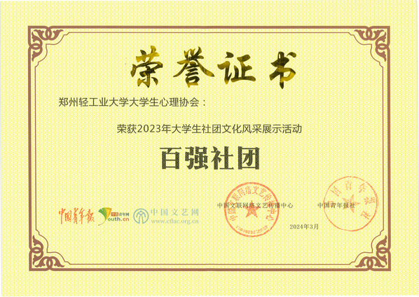 近日,中国文艺网和中国青年网发布《2023年大学生社团文化风采展示活动通报》,我校大学生心理协会入选“大学生社团文化风采展示活动百强社团”,心理健康教育中心教师谢杏利获评“优秀指导教师”,我校荣获“优秀组织单位”。