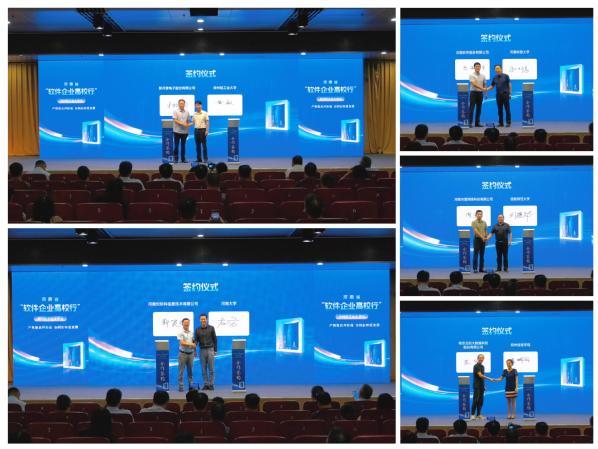合作签约环节,新开普电子股份有限公司与开云手机版登录入口、 河南创新科信息技术有限公司与河南大学、众智软件股份有限公司与河南科技大学、河南传鼎网络科技有限公司与信阳师范大学、南京云创大数据科技股份有限公司与郑州经贸学院分别签约合作。
