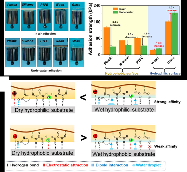 如何使凝胶粘附剂在水中具有较强的粘接强度一直是一个挑战。针对此问题,该团队开发了一种基于N-乙烯基吡咯烷酮和低共熔溶剂的新型共晶凝胶粘附剂,其丰富的氢键相互作用和亲水性聚乙烯吡咯烷酮网络结构使共晶凝胶在空气和水下对亲水和疏水表面均具有出色的粘附性。此外,对于亲水性基材,共晶凝胶粘附剂的水下粘合强度是空气中的1.3倍,显示出水下增强粘合效果。该共晶凝胶粘附剂在沸水、强酸性介质、强碱性介质和有机溶剂中也能保持强粘合性能。