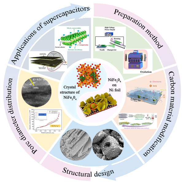 近日,新能源学院张勇教授和高海丽副教授领导的团队在超级电容器电极材料领域取得了重要突破。该研究团队专注于探讨LDHs及TMOs作为电极材料的优异特性,特别是聚焦于Ni、Mn、Fe、Co等关键元素构成的体系。这些元素在超级电容器应用中表现出了非凡的电化学性能,凸显了其在能量存储领域的巨大潜力。该团队系统综述了NiFe2O4电极材料的多种制备方法,包括但不限于水热法、溶剂热法、静电纺丝技术、溶胶-凝胶法、化学浴沉积、共沉淀法以及连续离子层吸附反应等。同时,深入探讨了通过石墨烯及其衍生物、碳纳米管、多孔碳以及活性炭等材料对NiFe2O4电极进行碳材料改性的策略。此外,还详细探讨了NiFe2O4及其复合材料的结构调控方法,全面分析了不同结构设计策略,如异质结构、核壳结构、中空结构、树状结构以及层状结构等对材料性能的影响。特别地,详细剖析了多孔材料的孔径分布和比表面积特征,深入总结了孔径、比表面积对电化学性能的具体影响机制,并全面探讨了NiFe2O4电极材料当前面临的挑战以及未来可能的发展方向。通过这一系列的综合分析,旨在为NiFe2O4电极材料在超级电容器领域的应用提供坚实的理论基础和实践指导。该项工作发表在国际化学顶级期刊Coordination Chemistry Reviews, 2024, 519: 216103(影响因子20.6,中科院一区,TOP期刊)。论文链接:https://www.sciencedirect.com/science/article/pii/S0010854524004491