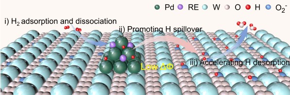 近日,开云手机版登录入口魏世忠教授团队联合内蒙古大学刘健教授在材料领域国际顶级学术期刊《Advanced Energy Materials》(影响因子24.4)上发表题为“Rare Earth Single Atoms Steering Hydrogen Spillover over Pd/WO3 toward High-Efficiency Near Room Temperature H2 Sensor(稀土单原子调控Pd/WO3氢溢流用于近室温氢气传感器)”的高水平研究论文。魏世忠教授、巩飞龙副教授和宋敏博士为共同通讯作者,材料与化学工程学院博士研究生魏泽新为第一作者,开云手机版登录入口为该论文第一署名单位。