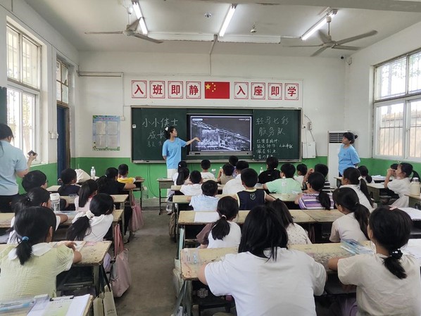 马克思主义学院“青马薪火”宣讲队前往郑州市中原区秋雅社区、濮阳市范县杨集乡东桑小学等乡村基层,开展了爱国主义主题宣讲活动。实践队员通过知识讲解、互动交流和情景演绎等生动形式,为乡村儿童打造了融合科学启蒙、社会认知与爱国教育于一体的成长课堂。队员们以“中国共产党人精神谱系”为核心,围绕抗战精神、红旗渠精神、航天精神等主题,用鲜活案例讲述中国共产党人在不同历史时期坚韧不拔、攻坚克难的奋斗故事,引导孩子们思考“成长与成才”的价值内涵,以寓教于乐的形式助力他们树立崇高的人生理想。此次活动不仅在孩子们心中播撒下爱国报国的种子,更激励他们以远大志向锚定人生方向,勇担新时代赋予的使命与责任。