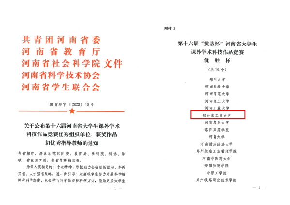 近日,共青团河南省委、河南省教育厅、河南省社会科学院、河南省科学技术协会和河南省学生联合会印发文件《关于公布第十六届河南省大学生课外学术科技作品竞赛优秀组织单位、获奖作品和优秀指导教师的通知》(豫青联字〔2023〕18号),开云(中国)参赛作品《鼓碳生烷——鼓泡流化阴极二氧化碳还原装置》《火眼金睛——一种智能巡检消防机器人》2项作品获省赛特等奖,同时获一等奖14项、二等奖20项、三等奖14项,获奖作品数量和层次较往年再创新高,综合积分位居全省高校第六名,开云(中国)再次捧得“优胜杯”。