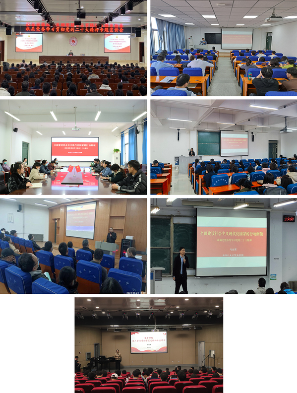 机关党委、食品与生物工程学院、材料与化学工程学院、经济与管理学院、政法学院、数学与信息科学学院、体育学院等单位邀请我校党委讲师团黄天弘、冯合国、谢月华、李贵、闫茂伟、李燕等成员,他们以《全面建设社会主义现代化国家的行动纲领——准确完整系统学习党的二十大精神》《以中国式现代化全面推进中华民族伟大复兴》《深入学习党的二十大报告 历史的科学的理解中华民族伟大复兴的必由之路》为题,深入解读党的二十大精神。