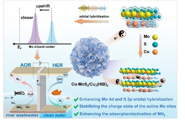 氨作为重要化工原料,在医药、食品、农业领域应用广泛,还是潜在氢载体,但易随废水排放,因高水溶性危害环境与人体健康。电催化氨氧化反应(eAOR)是关键去除手段,不仅能将氨转化为无污染的氮气和水,还可替代高过电位、慢动力学的析氧反应,与析氢反应结合加速产氢,兼具环保与能源价值。针对电催化氨氧化反应困境,利用界面电子调控工程制备出新型2D/2D Cu-MoS/Cu(HIB)异质结电催化剂,该催化剂可显著促进电子转移并调控活性位点反应性,具备高效的eAOR与析氢反应性能。所组装的电解装置在相对于可逆氢电极1.60 V的电压下,实现了约100%的氨去除率,产氢速率达15.3 mL/h,为同步实现废水处理与绿色制氢提供了一条可持续途径。
